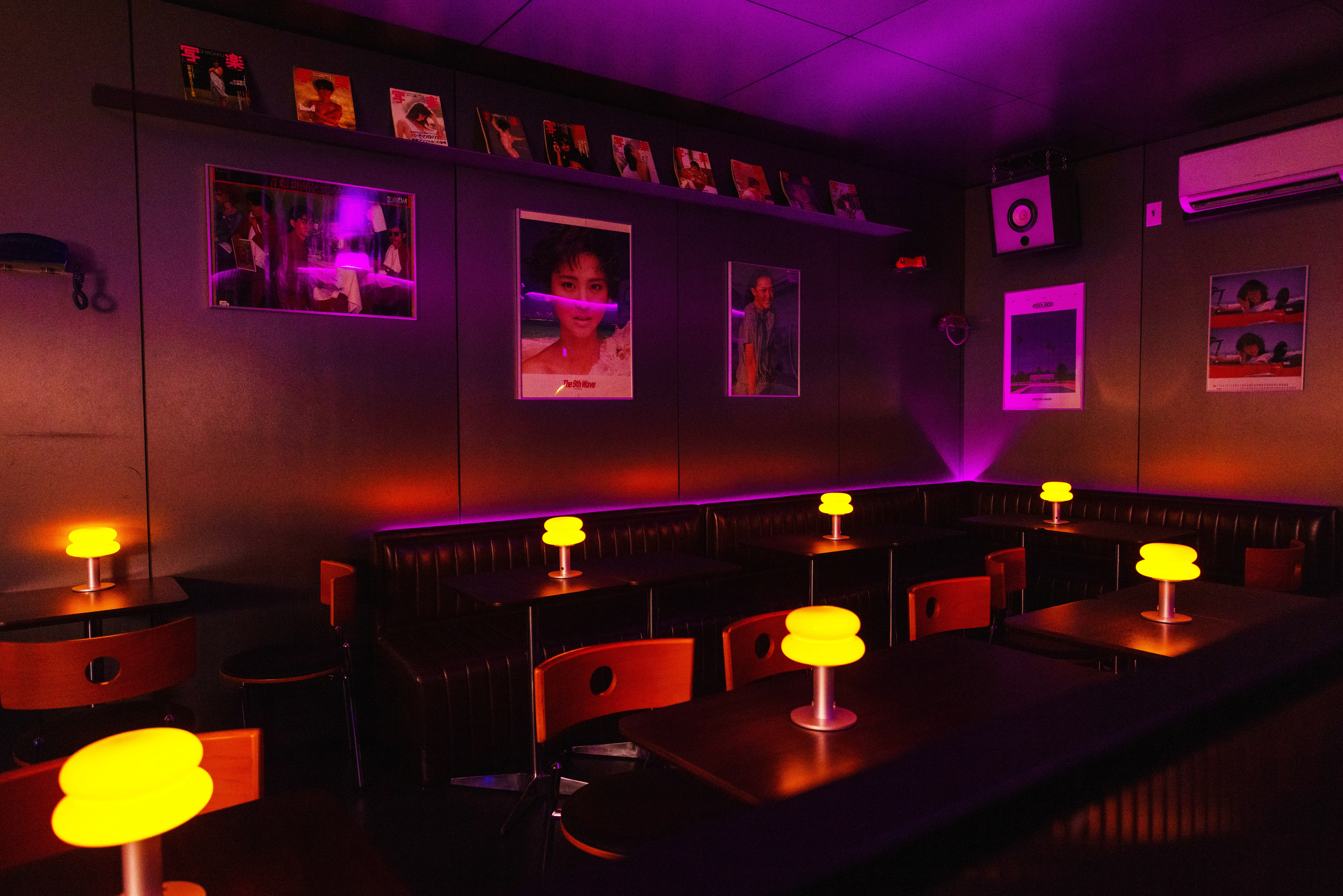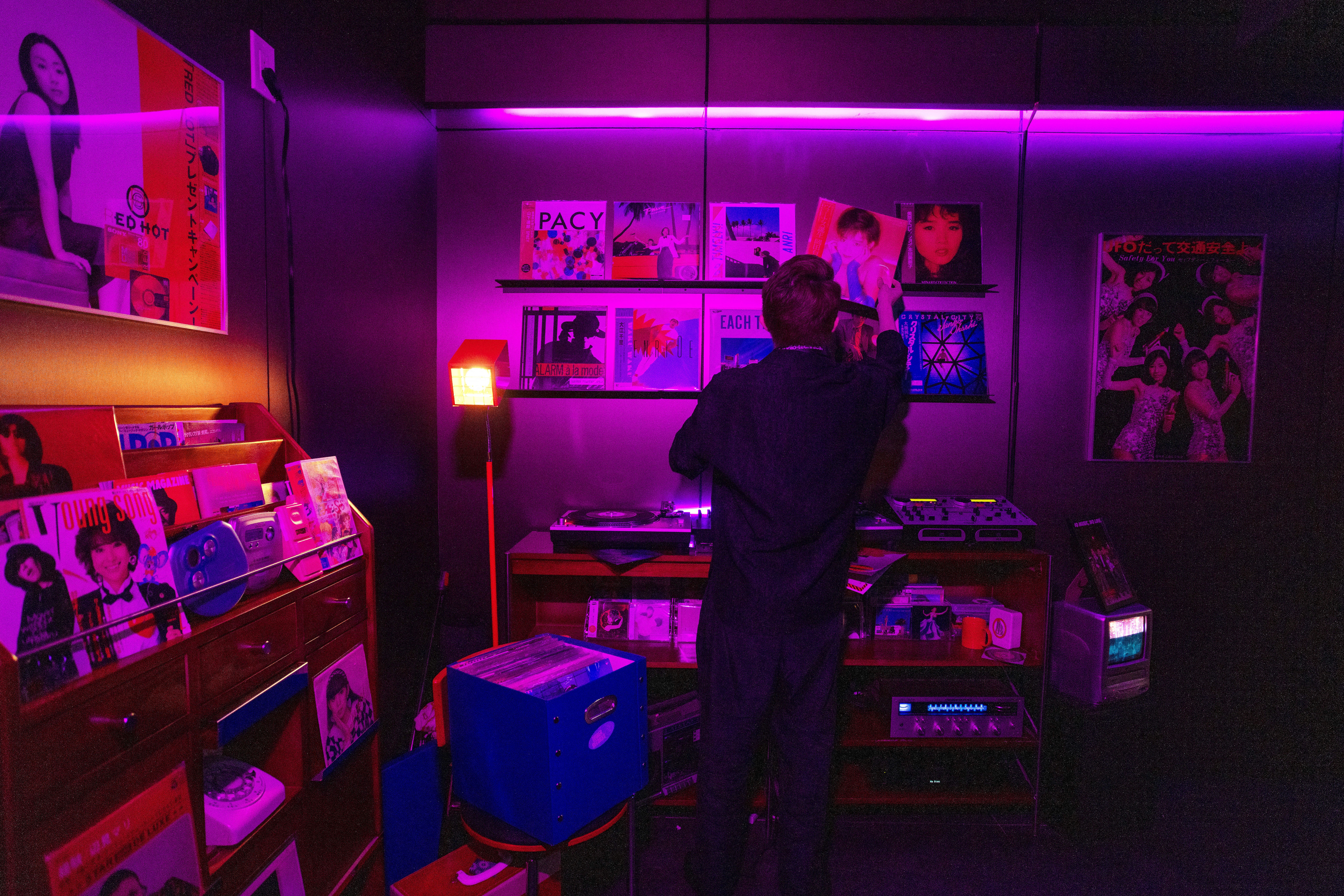 Walls are not treated as finishes, but as carriers of narrative. Vintage Japanese posters, vinyl records, and analog equipment form a curated memory landscape—half listening room, half private archive. The DJ corner is not a stage; it is a working desk inside a living collection.