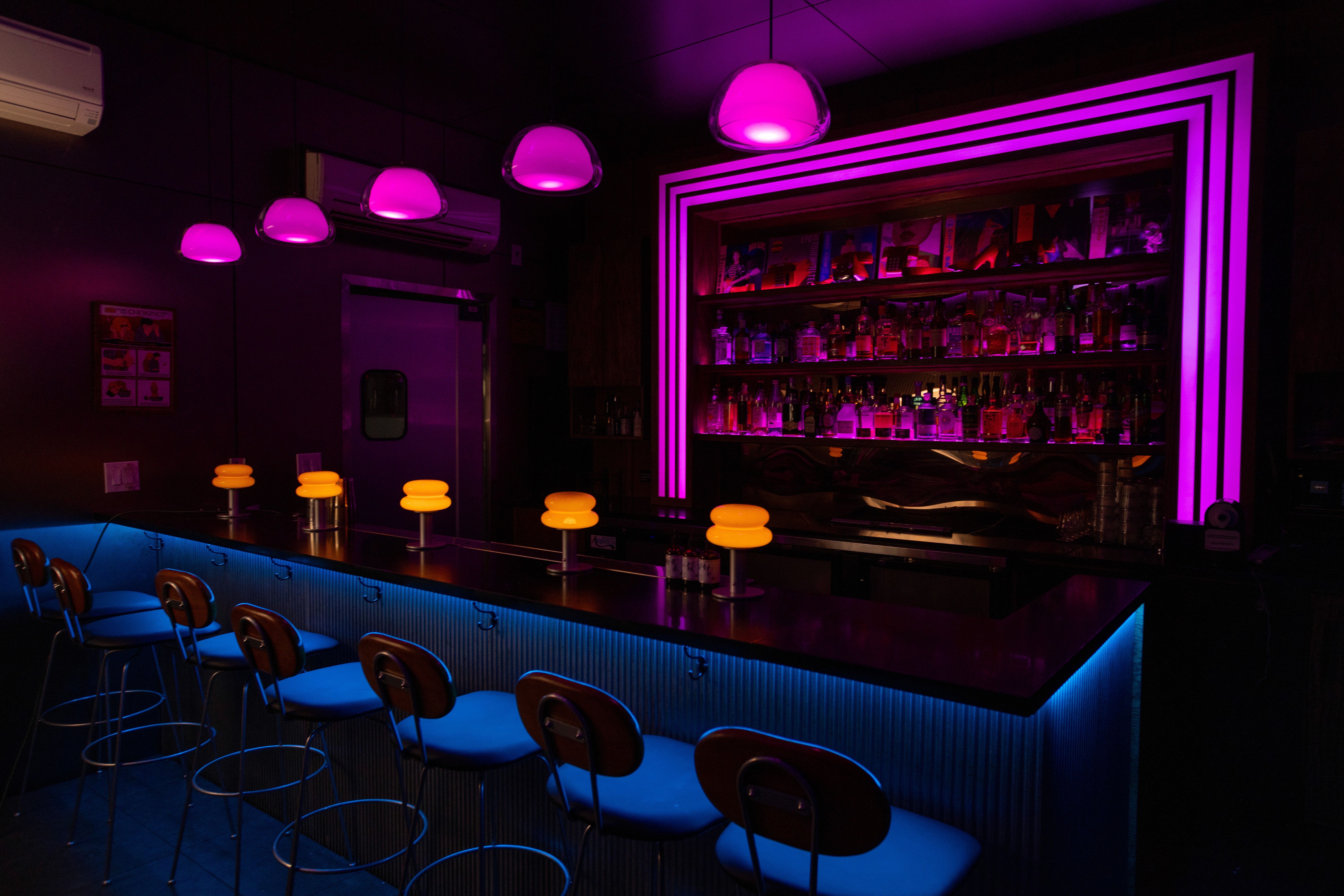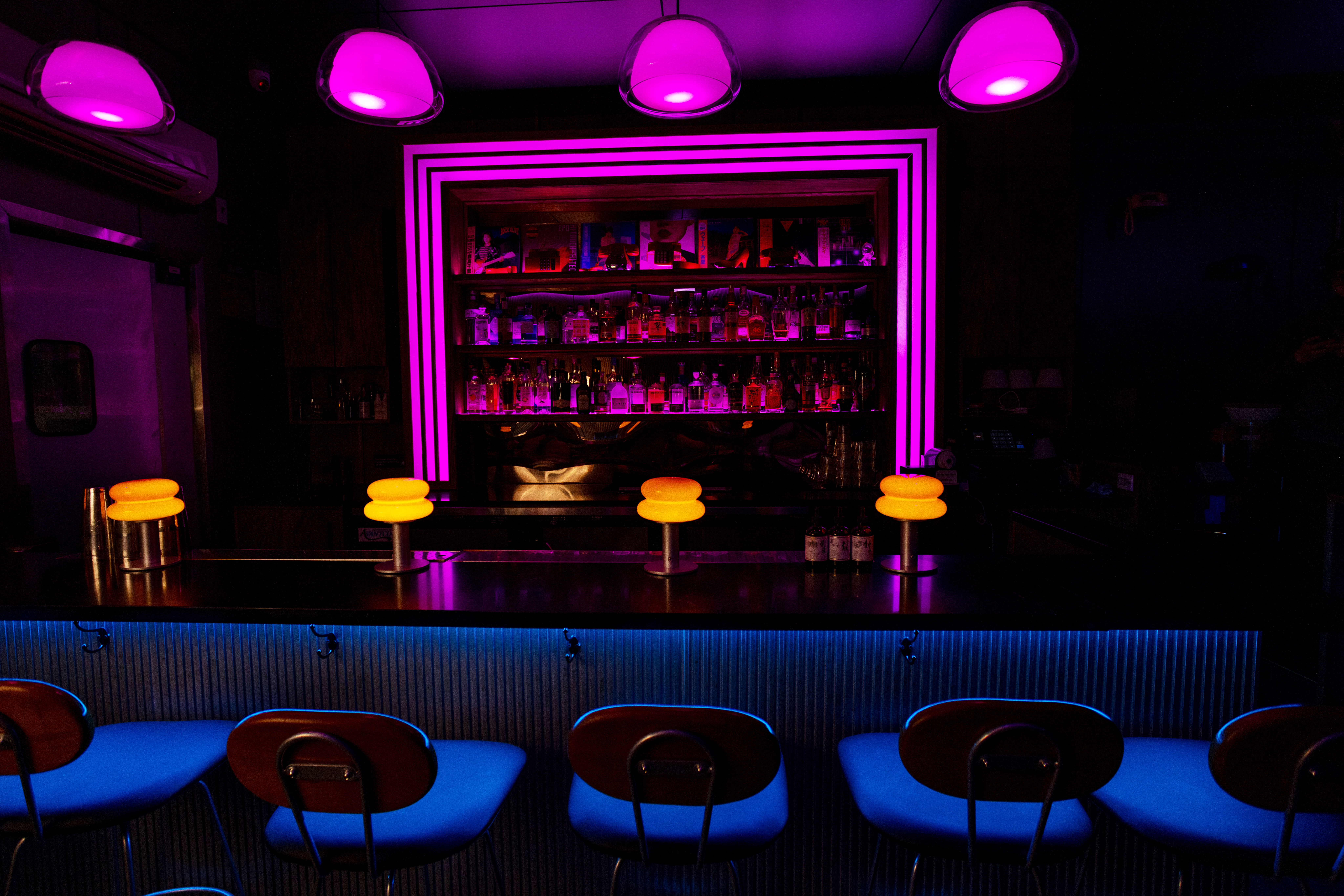 The bar becomes the luminous anchor: a glowing frame of neon outlines a dense archive of bottles, turning the act of drinking into a ritual performed inside light itself. Along the perimeter, continuous banquettes and small tables form an intimate social field—close, low, and intentionally enclosed.