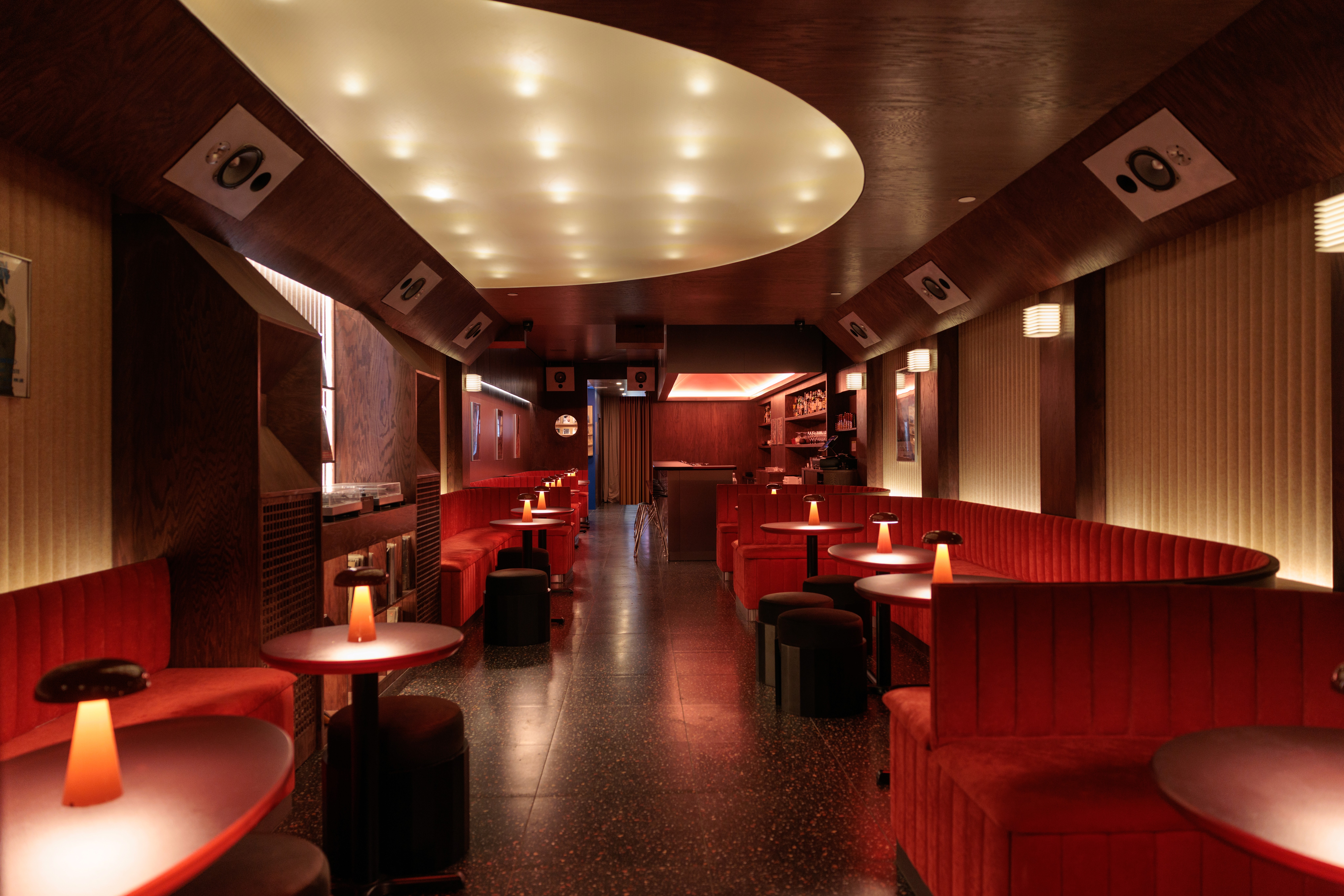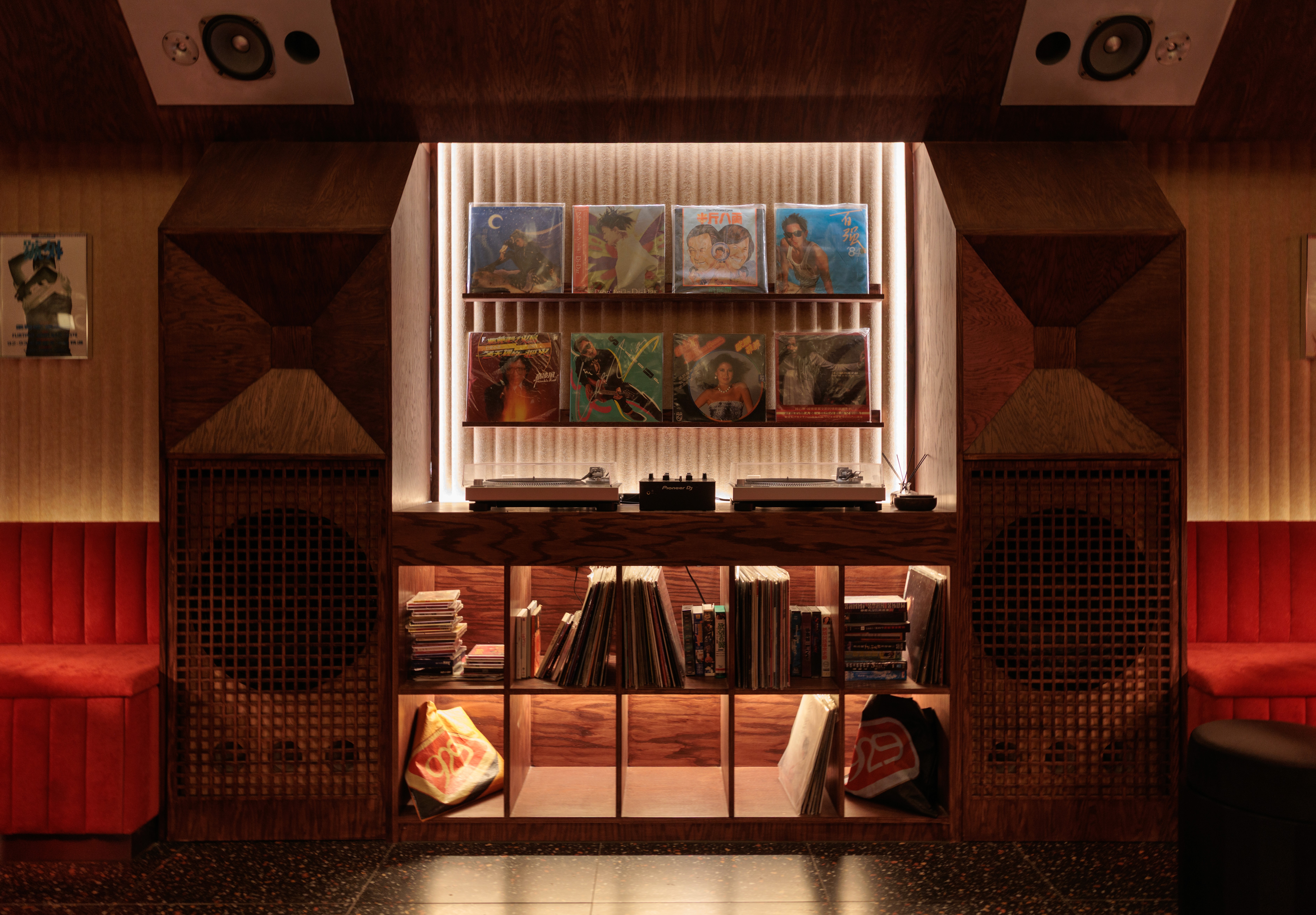 A central record wall—both archive and altar—introduces another layer of presence: sound as material, memory as texture. The space does not merely host music and conversation; it absorbs them.