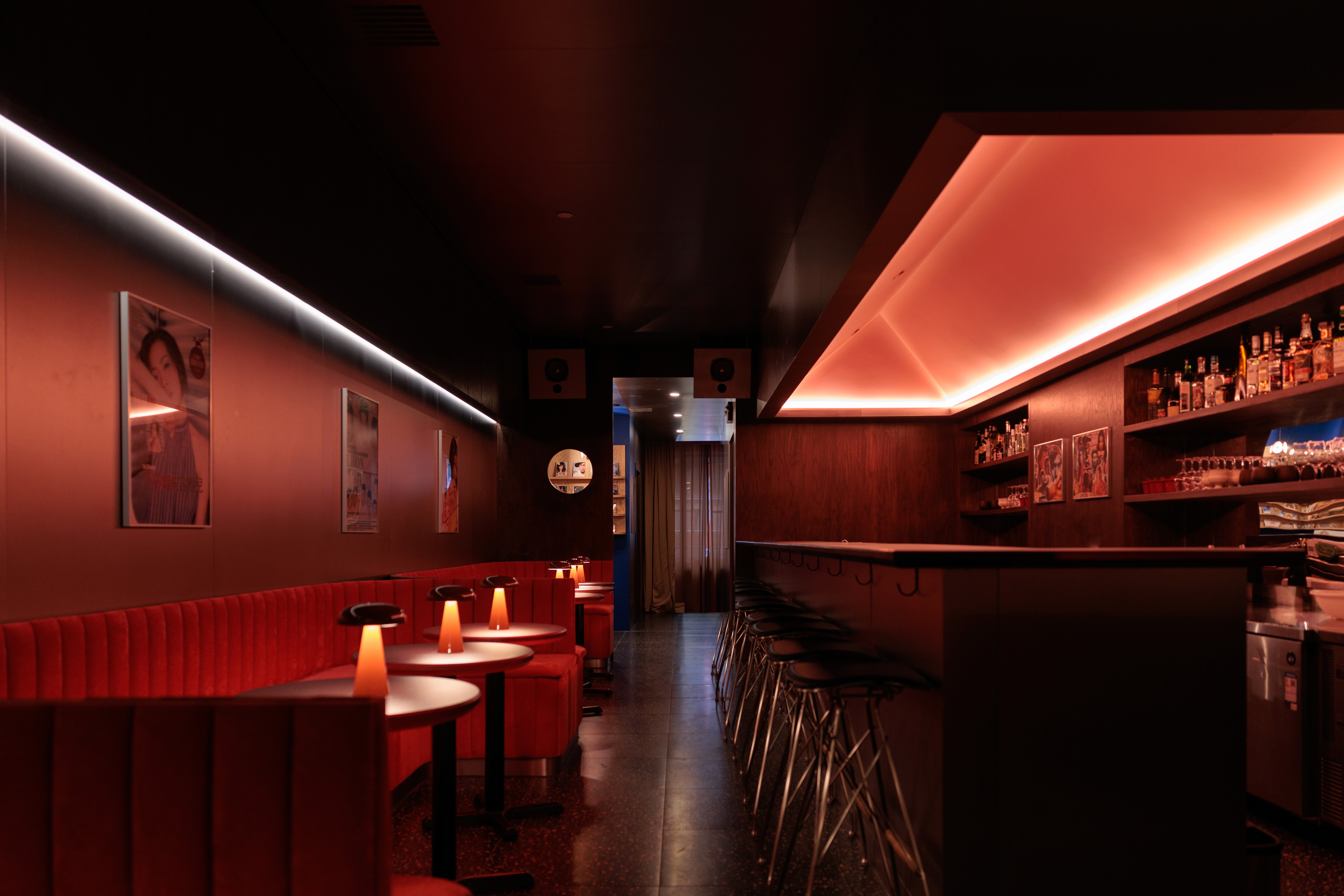 Along the perimeter, deep red banquettes form a continuous social landscape—both tactile and graphic—contrasting the sobriety of the architecture with a quiet sensuality. Small tables and low amber lamps create islands of pause within the larger room, allowing the space to oscillate between collective energy and private retreat.