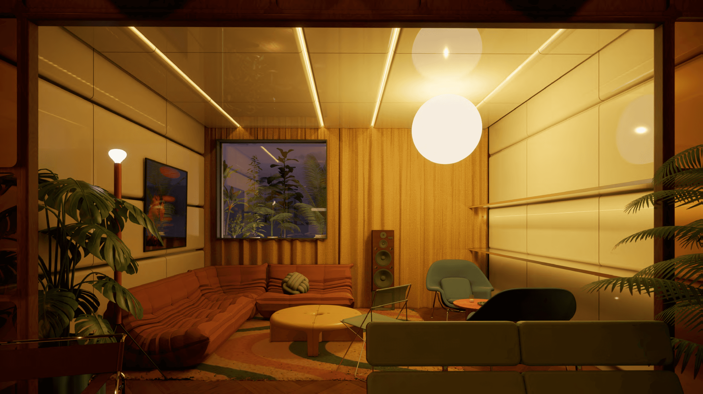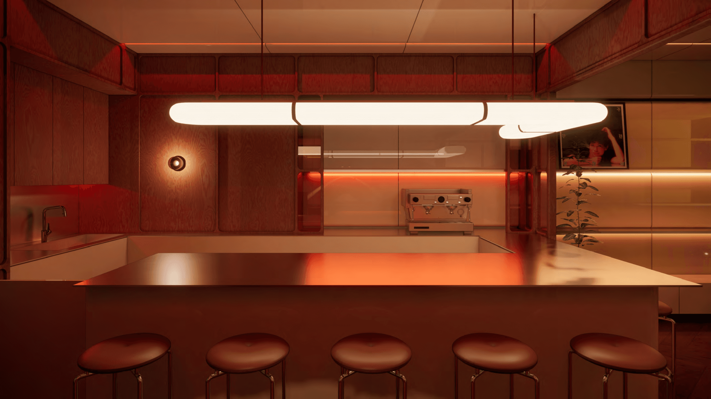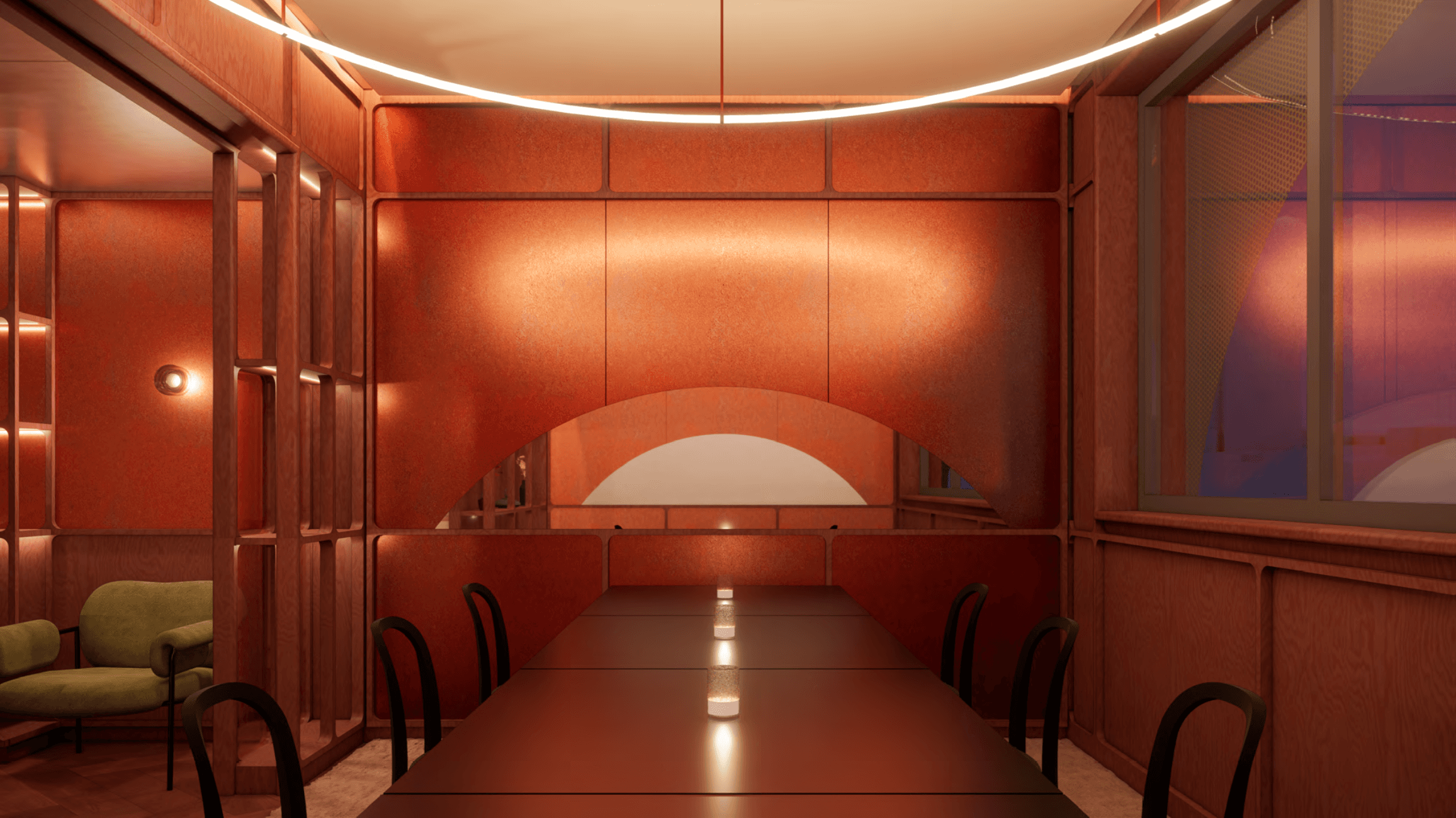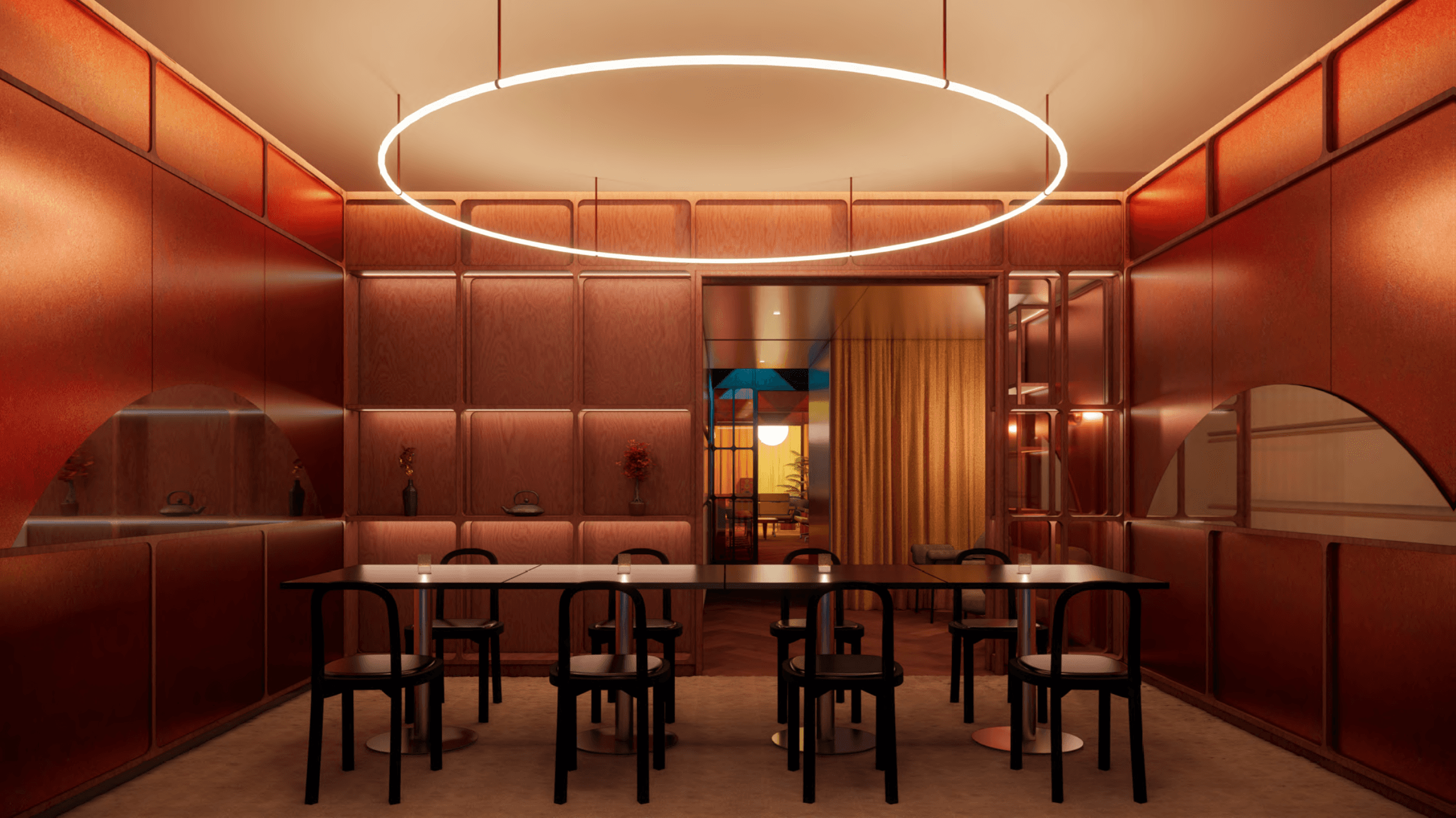 Light is not applied—it is constructed. Linear ceilings, glowing panels, and circular luminaires become architectural elements, suspending the interior between softness and precision. Colors—amber, red, cream, and gold—are not decorative accents, but spatial temperatures that define mood and tempo.