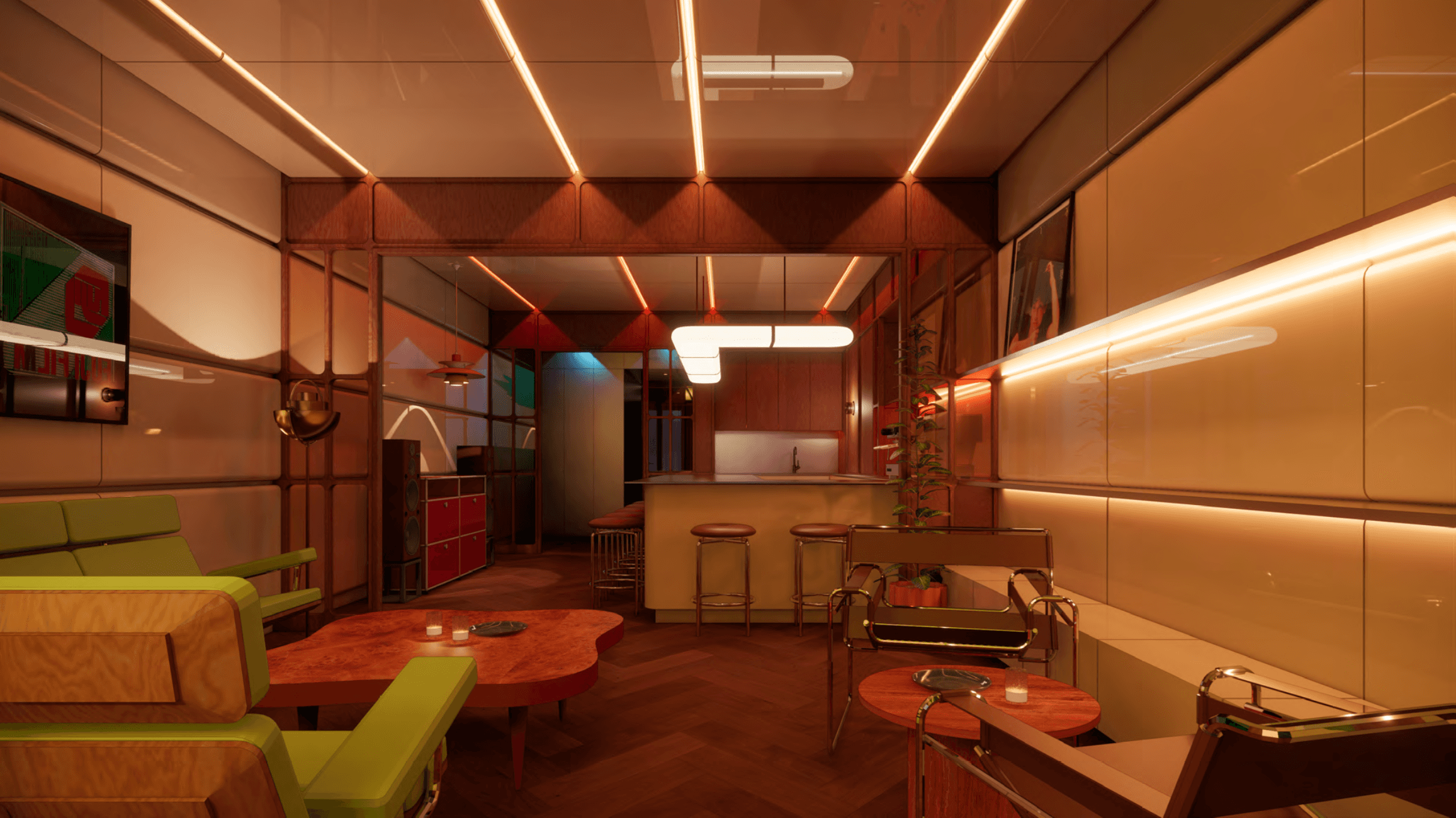 At the center, a compact bar and gathering area anchors the apartment as a social instrument—allowing the home to expand and contract between intimacy and event. Sliding glass frames, mirrored planes, and framed openings choreograph movement, turning circulation into a slow, cinematic reveal.