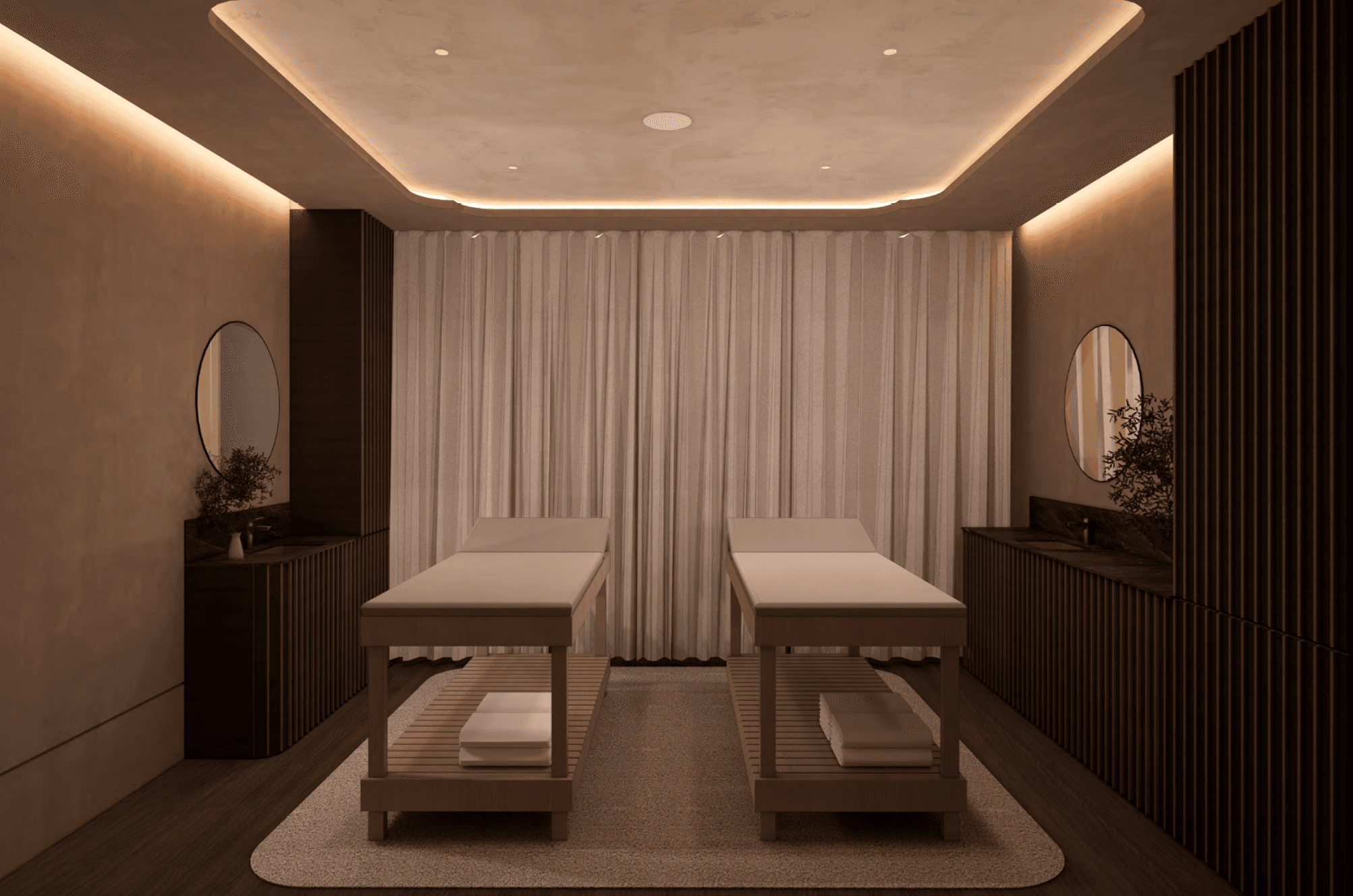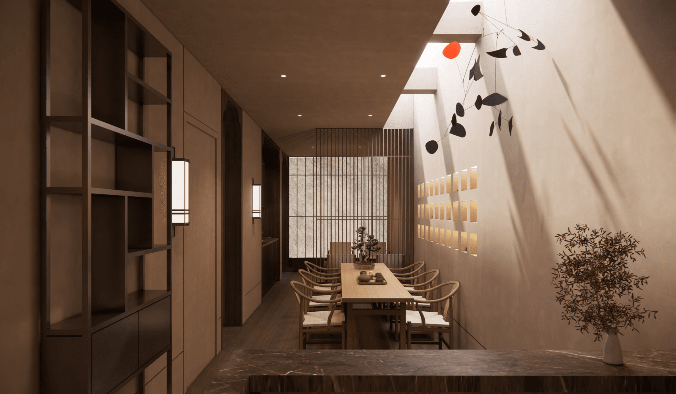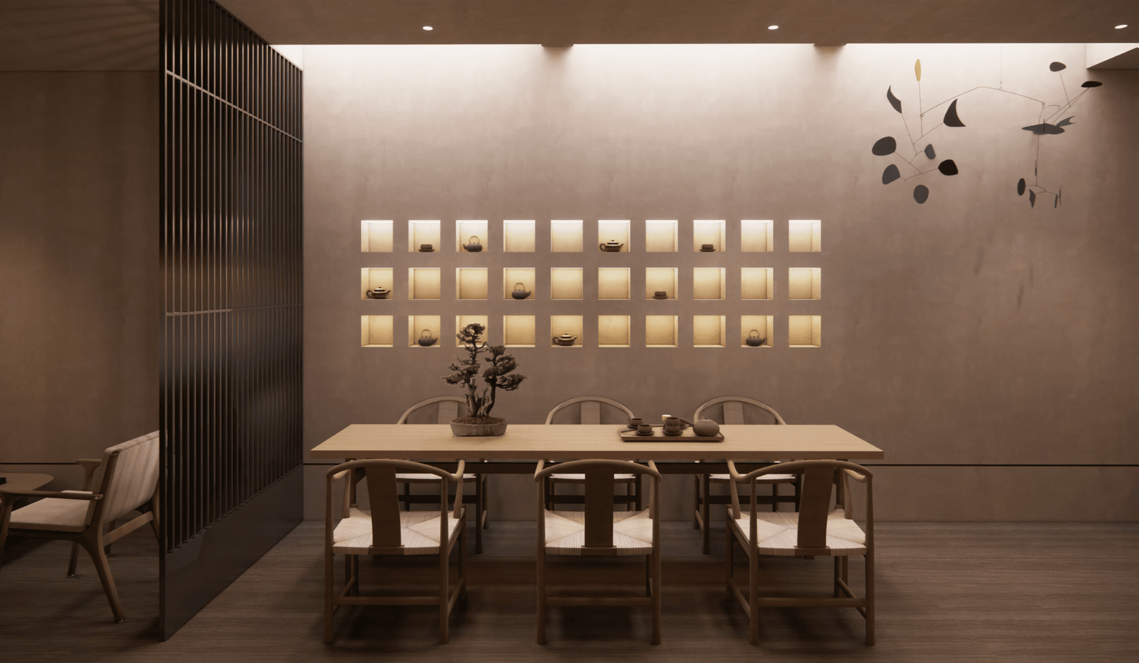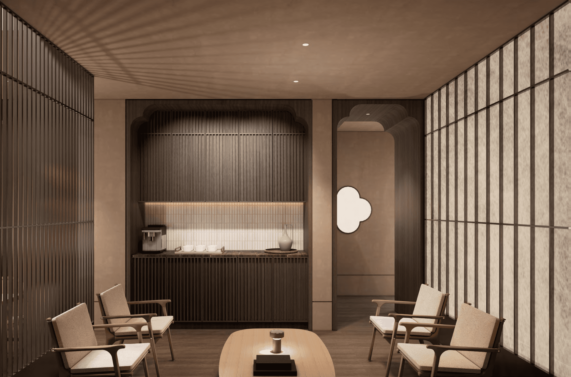 Spatial sequence is slow and deliberate. Slatted partitions, translucent screens, and curved openings create a choreography of partial views and softened boundaries, guiding the body from arrival into stillness. Each room is composed as a chamber of pause—neither fully open nor fully closed, but held in a state of quiet suspension.