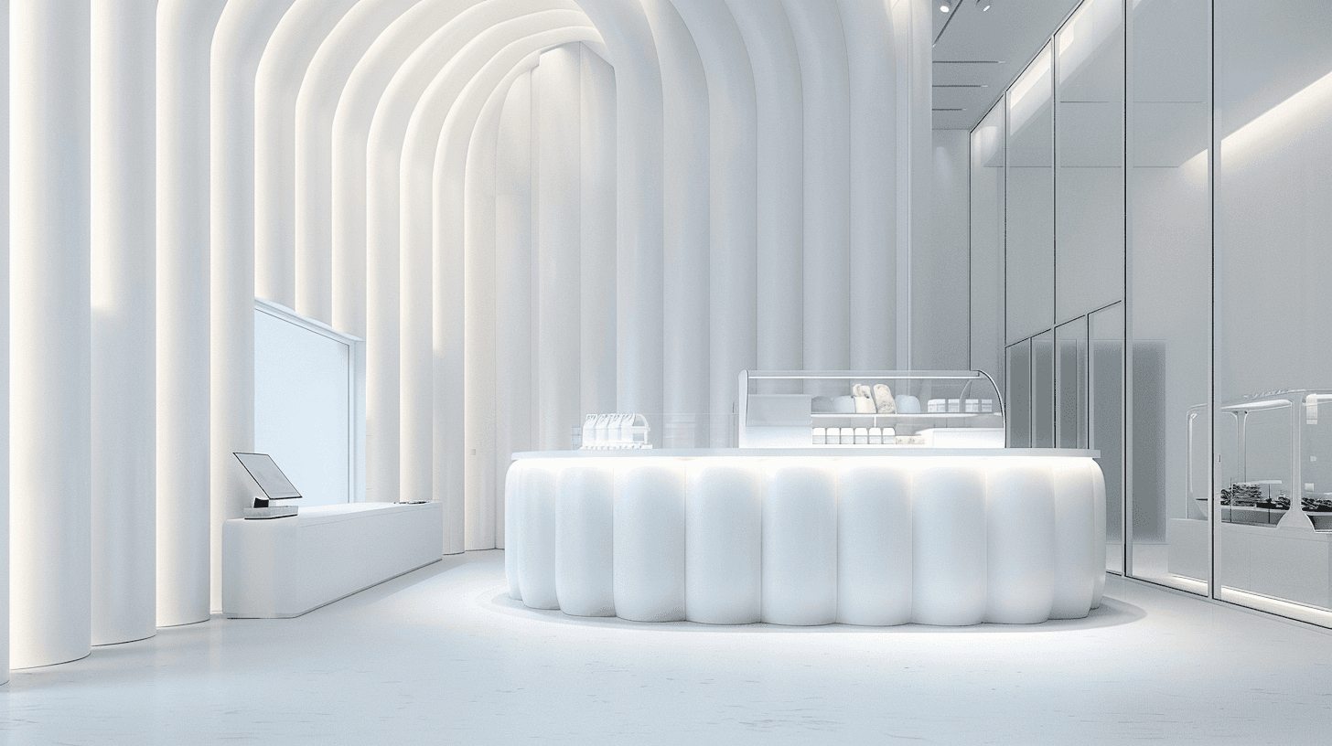 The space is built on repetition and rhythm. Inflated vertical panels frame the interior like an arctic cathedral, creating a surreal quietness where light becomes material. The counter floats in the center like a soft-core monolith—functional yet playful, tactile yet abstract.